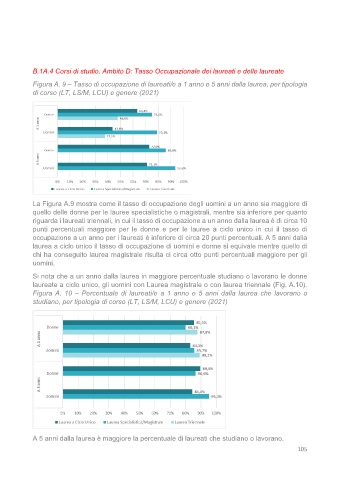 Figura A. 9 – Tasso di occupazione di laureati/e a 1 anno e 5 anni dalla laurea, per tipologia