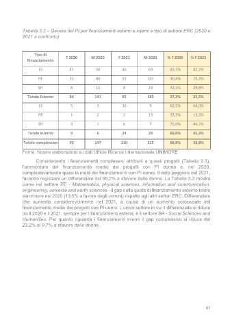 Tabella 3.2 – Genere del PI per finanziamenti esterni e interni e tipo di settore ERC (2020 e