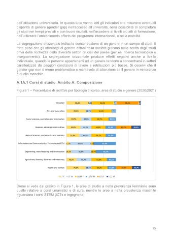 Figura 1 – Percentuale di iscritti/e per tipologia di corso, area di studio e genere (2020/2021)