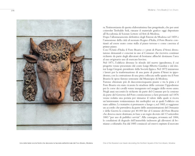 Una delle teste bovine fiorite che decorano la facciata settentrionale del Foro Boario, Modena One of the flowered cow heads decorating the Northern façade of the Foro Boario, Modena L’orologio del fronte settentrionale, Foro Boario, Modena